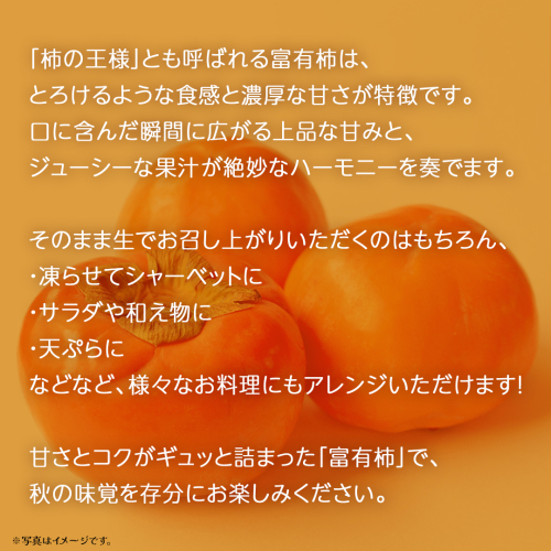 「柿の王様」とも呼ばれる富有柿は、とろけるような食感と濃厚な甘さが特徴です。