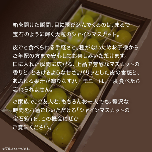 贅沢な時間をお過ごしいただける「シャインマスカットの宝石箱」を、この機会にぜひご賞味ください。