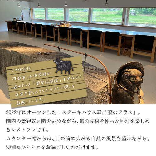 ★森のテラスの庭園を眺めながらお食事をお楽しみ下さい ★赤身ステーキ200gにハンバーグも付きます 2022年オープンしたステーキハウス森吉森のテラス。 この施設は森のテラスの園学式庭園を見ながら、食事を楽しんでいただきたい想いを表現しています。 カウンター席で目の前に広がる風景を眺めながら、食事をお楽しみください。 営業時間:11:30~14:00(入店13:30)、17:30~21:00(入店19:00) 定休日:毎週月曜日 お食事内容:赤身ステーキ200gハンバーグ付き、サラダ、ライスまたはパン、スープ、デザート、ドリンク ■ 秋田県 北秋田市 ■ ステーキハウス 森のテラス 庭園 庭 風景 景色 赤身肉 ハンバーグ