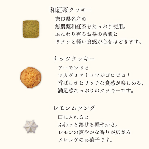 奈良県産無農薬茶葉をたっぷり使った「和紅茶クッキー」など、ひとつひとつに物語があり、贈る人のセンスが伝わるラインナップです。