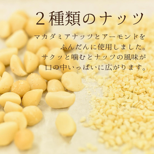 ナッツクッキー(小麦粉(国産),バター,マカダミアナッツ,砂糖,アーモンドダイス,卵白(卵を含む),卵黄,コアントロー(オレンジを含む)),