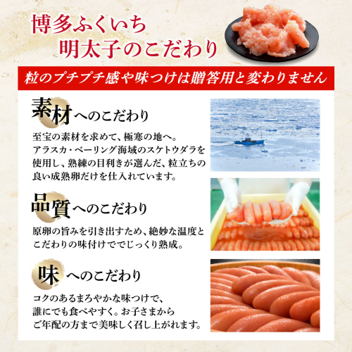 ご家庭用の大定番と言えば、博多ふくいちの味っ子!! 製造過程で小さく切れてしまった明太子を集めました。 切る手間なく、袋から出したらそのまま食卓に出せてとても便利。おにぎりやスパゲティー、和え物にもオススメです。 ご家族で、お友達同士で、ボリュームたっぷりの明太子を、皆様でお召し上がりください。 【保存方法】冷蔵(10℃以下で保存) 【原材料】 すけとうだらの卵巣(ロシア又はアメリカ)、発酵調味料、食塩、唐辛子、かつお風味調味料/調味料(アミノ酸等)、甘味料(ソルビット)、酸化防止剤(ビタミンC)、ナイアシン、酵素、着色料(赤102、黄5、赤3)、発色剤(亜硝酸Na)、(一部に小麦・大豆を含む) 【事業者】 株式会社 博多ふくいち 【地場産品基準】 5-3:当該地方団体の区域内において返礼品等の製造、加工その他の工程のうち主要な部分を行うことにより相応の付加価値が生じているものであること。