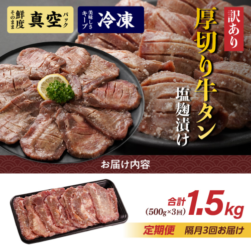 隔月3回お届け!《訳あり》厚切り牛タン塩麹漬け定期便(500g×3回)_T27-3-3301