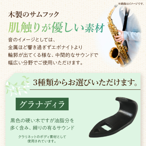 【説明】 木製のサムフックは、肌触りが優しい素材です。 音のイメージとしては、金属ほど響き過ぎずエボナイトより輪郭が出てくる様な、中間的なサウンドで幅広い分野でご使用いただけます。 ■素材紹介:3種類をご用意していますので選択してください。 1)グラナディラ:黒色の硬い木ですが油脂分を多く含み、締りの有るサウンド。 ※クラリネットのボディ素材として使用されています。 2)シタン:茶褐色の硬い木ですが油脂分を多く含み、締りの有るサウンド。 3)ボコーテ:黄色から茶褐色に変色し、やや柔らかい木で杢目がはっきり表れ、柔らかい部分と硬い部分が交錯している事で、音の響きをやや吸収しダークなサウンドに近づく。 【地場産品基準】 3号:返礼品の重量や付加価値の半分を一定程度上回る割合が小牧市内で行われる工程によるものである。なお、小牧市内で行われる工程は、原材料仕入から最終工程まですべてである。