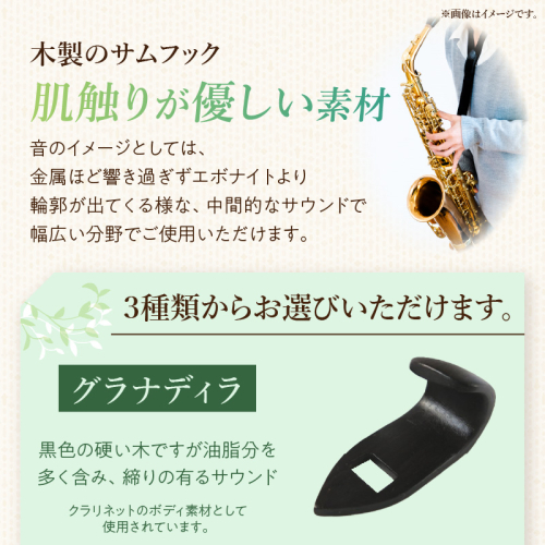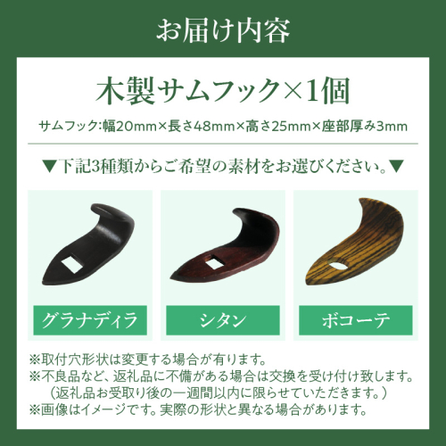 【説明】 木製のサムフックは、肌触りが優しい素材です。 音のイメージとしては、金属ほど響き過ぎずエボナイトより輪郭が出てくる様な、中間的なサウンドで幅広い分野でご使用いただけます。 ■素材紹介:3種類をご用意していますので選択してください。 1)グラナディラ:黒色の硬い木ですが油脂分を多く含み、締りの有るサウンド。 ※クラリネットのボディ素材として使用されています。 2)シタン:茶褐色の硬い木ですが油脂分を多く含み、締りの有るサウンド。 3)ボコーテ:黄色から茶褐色に変色し、やや柔らかい木で杢目がはっきり表れ、柔らかい部分と硬い部分が交錯している事で、音の響きをやや吸収しダークなサウンドに近づく。 【地場産品基準】 3号:返礼品の重量や付加価値の半分を一定程度上回る割合が小牧市内で行われる工程によるものである。なお、小牧市内で行われる工程は、原材料仕入から最終工程まですべてである。