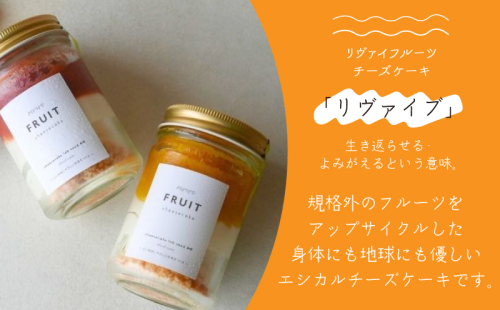 「リヴァイブ」生き返らせる・よみがえるという意味。 規格外のフルーツをアップサイクルした身体にも地球にも優しいエシカルチーズケーキです。 国産のクリームチーズ・純正生クリーム・フルーツソースを使用した味わい深く贅沢なレアチーズケーキです。 ・エシカル苺:生クリーム(生乳(北海道産))、砂糖(粗糖)、苺クリームチーズ、ヨーグルト、玄米粉、米油、レモン果汁、牛乳ゼラチン、食塩、(一部に乳成分・ゼラチンを含む) ・和歌山県産オレンジ:生クリーム(生乳(北海道産))、オレンジピューレ、クリームチーズ、砂糖(粗糖)、ヨーグルト、玄米粉、米油、レモン果汁、牛乳、ゼラチン、食塩、(一部に乳成分・オレンジ・ゼラチンを含む) 製造:田尻町 ※田尻町との共通返礼品 アレルギー表示:乳・ゼラチン・オレンジ 本品製造工場では、卵、乳、小麦、ゼラチン、アーモンド、ごま、オレンジ、バナナ、もも、りんご、を含む製品を生産しています。 ※ 表示内容に関しては各事業者の指定に基づき掲載しております。 賞味期限:発送時点で40日以上の返礼品をお届けします。(冷凍保存) ※解凍後2日間