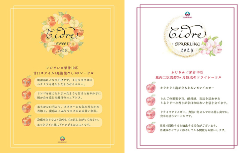 ふじりんご100%のシードルを甘口・辛口2本セットにしてお届けします。