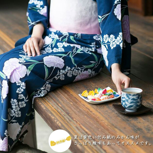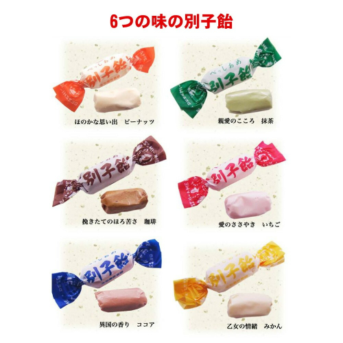 こだわりの水飴と乳製品に砂糖を主原料として、 みかん・いちご・ピーナッツ・抹茶・ココア・珈琲とミルクをかけ合わせて1粒ごとに昔ながらのレトロな包み紙で包み仕上げました。