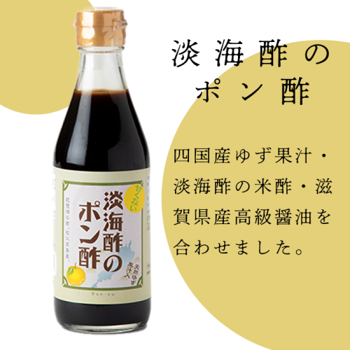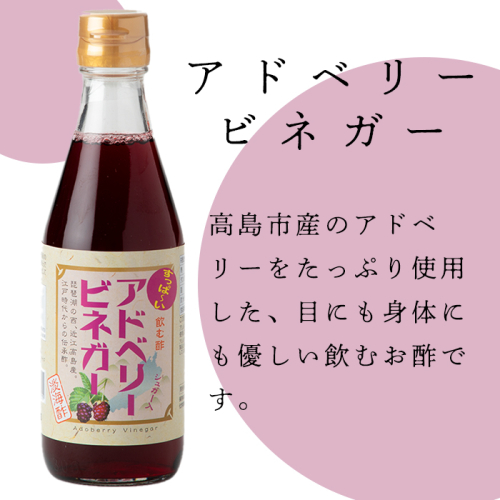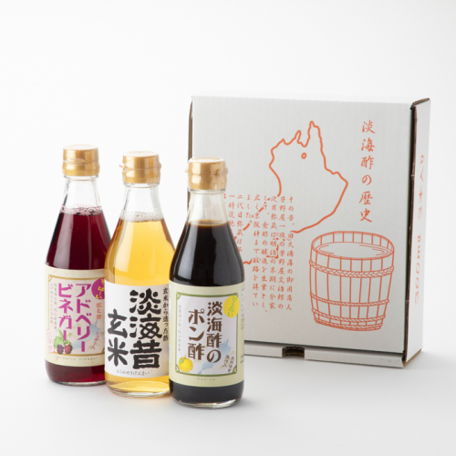 寿司や酢の物、ドレッシング向けの高島産米酢と、5から6倍に薄めて飲むアドベリーを使った飲む酢、お鍋料理や、白身魚の薄造りなどに最適な甘くないこだわりポン酢をセットにしました。