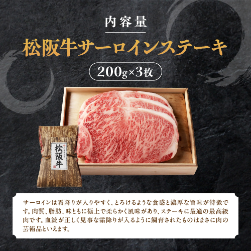 - 松阪牛 サーロインステーキ 600g (200g×3枚) 厚みしっかり 極上の柔らかさ 化粧箱入り 柔らかい 松坂牛 松阪肉 霜降り 高級ブランド牛 ロース サーロイン ステーキ ビフテキ 焼肉 自宅用 贈答品 化粧箱 ギフト お歳暮 牛肉 とろける 和牛 三重県 A4 A5 特産松阪牛 TKG-63