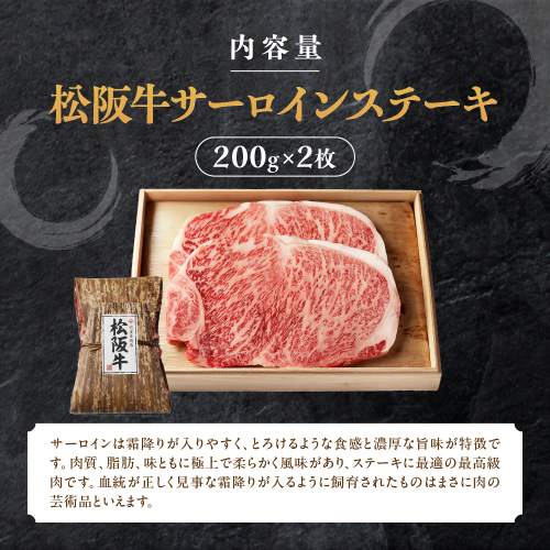 - 松阪牛 サーロインステーキ 400g (200g×2枚) 厚みしっかり 極上の柔らかさ 化粧箱入り 柔らかい 松坂牛 松阪肉 霜降り 高級ブランド牛 ロース サーロイン ステーキ ビフテキ 焼肉 自宅用 贈答品 化粧箱 ギフト お歳暮 牛肉 とろける 和牛 三重県 A4 A5 特産松阪牛 TKG-62