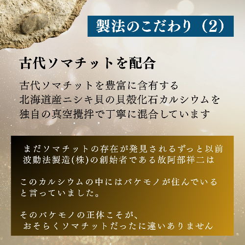 まだソマチットの存在が発見されるずっと以前、波動法製造(株)の創始者である故阿部祥二は、「このカルシウムの中にはバケモノが住んでいる」と言っていました。そのバケモノの正体こそが、おそらくソマチットだったに違いありません。