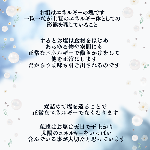 創業者は1980年、海水が太陽と風の力だけで塩となる“原点の姿”に着目し、そこに宿る自然本来の力に深い関心を寄せました。現代科学でも、すべての物質は「粒子」と「波動」の両方の性質を持つとされています。