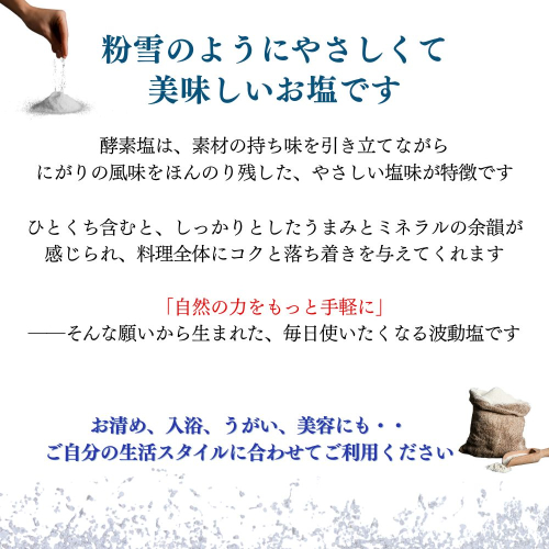 酵素塩は、素材の持ち味を引き立てながら、にがりの風味をほんのり残した、やさしい塩味が特徴です。ひとくち含むと、しっかりとしたうまみとミネラルの余韻が感じられ、料理全体にコクと落ち着きを与えてくれます。