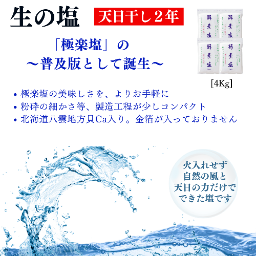 - 極楽塩の普及版 天日干し2年! 火入れしない生の塩 「酵素塩 1kgx4袋」 北海道産八雲産ニシキ貝の貝殻化石カルシ ウム入り こだわりの製法 塩 食塩 海塩 調味料 ソルト お清め 美容 入浴 うがい 歯磨き