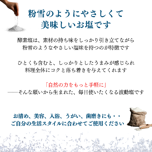 酵素塩は、素材の持ち味をしっかり引き立てながら、粉雪のようなやさしい塩味を持つのが特徴です。ひとくち含むと、しっかりとしたうまみが感じられ、料理全体にコクと落ち着きを与えてくれます。「自然の力をもっと手軽に」——そんな願いから生まれた、毎日使いたくなる波動塩です。お清め、美容、入浴、うがい、歯磨きにも・・ご自分の生活スタイルに合わせてご使用ください。
