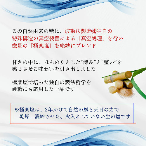 この自然由来の糖に、波動法製造(株)独自の特殊構造の真空装置による「真空処理」を行い、微量の「極楽塩」を絶妙にブレンド。甘さの中にほんのりとした深みと“整い”を感じさせる味わいを引き出しました。極楽塩で培った独自の製法哲学を、砂糖にも応用した一品です。