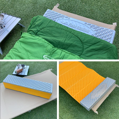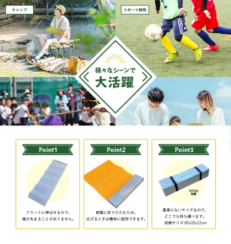厚み20mmで地面からの冷えや凸凹を緩和できる。超快適な寝心地マットや寝袋の下に敷くだけ。折り畳めるからコンパクトに!