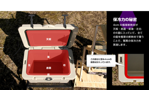 4cmの極厚断熱材が天板・底面・前後・左右の6面に入っていて、全ての面を極厚の断熱材で覆うことで、脅威の保冷力を実現します。
