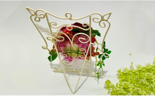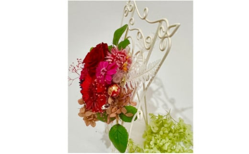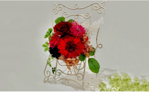 白いアイアンスタンドに濃い赤のバラを始め、ガーベラ、ジニアと魅力的な花達をアレンジしました。