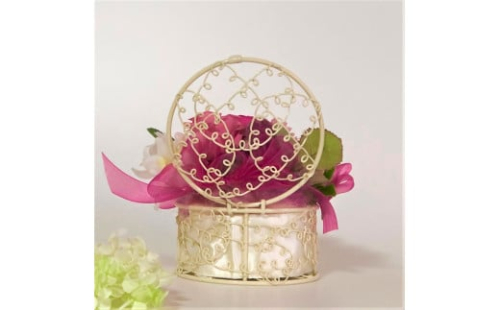 花器(ホワイトアイアン模様入り) / プラスチックケース / ドライフラワー / 赤ボンボンピック / ピンクパールピック / リボン