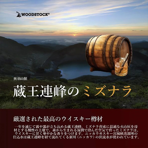 ウイスキーの樽材に使われる「ミズナラ」。ウイスキーの風味の60-70%は樽から生まれると言われ、樽材に含まれる香味成分が溶け出し、味わいに丸みを持たせ甘く華やかな香りをつけます。ウイスキーボトルやデキャンタにスティックを入れるだけ。そのまま数時間~数日間置き、お好みの香味でお楽しみください。蔵王連峰山麓のミズナラが原料。一年を通じて霧や靄が立ち込める蔵王連峰。ミズナラ育成に最適な火山灰を母材とする酸性の土壌で、森から生まれる湿潤で澄んだ空気で育ったミズナラは、ウイスキーに甘く華やかな香りをつけます。