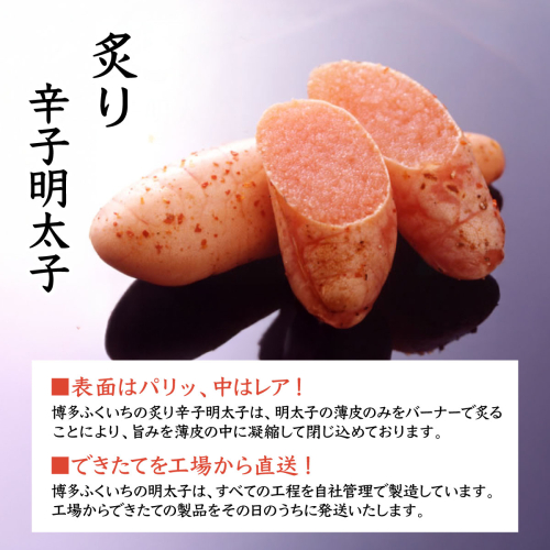 博多ふくいちの炙り辛子明太子は、明太子の薄皮のみをバーナーで炙り、表面はパリッ、中はレアの状態でお届けしております。