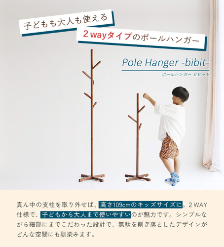 また、三本に分割されている支柱の内、真ん中の支柱を取り外すとお子さま用のポールハンガーとしてもご使用いただけます。