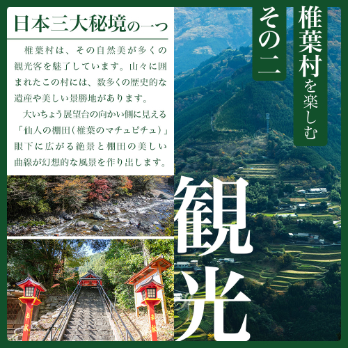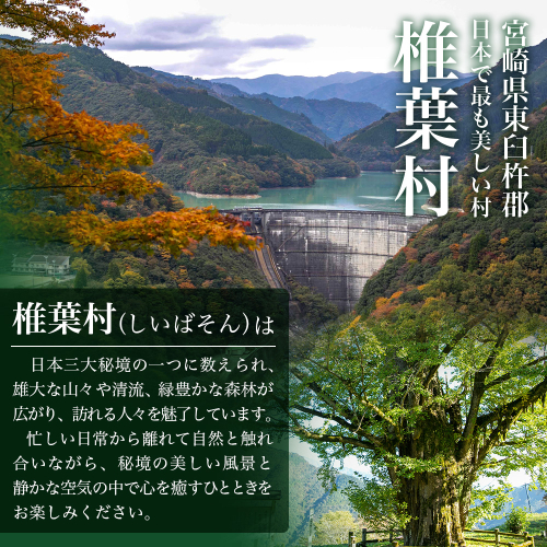 椎葉村は、人口約2500人の村で、九州山地のちょうど中央に位置しております。平家伝説が残る当村は、平家の鶴富姫と源氏の武将那須大八郎との恋物語の舞台となり、毎年11月に「平家まつり」が開催されています。日本三大秘境の一つとされ、村内には3つの河川の源流があり美しい空気と水と森林に囲まれております。「日本で最も美しい村連合」に加盟しており、村内松尾地区にある「仙人の棚田」の農村景観や伝統的で循環型農業の焼畑や神楽などの文化が評価され、「世界農業遺産高千穂郷・椎葉山地域」に認定されました。また、2020年7月にオープンされた交流拠点施設Katerie(かてりえ)では、九州初の図書管理システムが導入された図書館や村内外の企業やフリーランスの人が働くコワーキングスペースや交流ラウンジなど、子どもから大人まで楽しめる空間が広がっています。 椎葉村は、『夢 生きがい 幸せかてーりの里・椎葉』(かてーりとは相互扶助の精神)をモットーに、全国の皆さまへ精一杯の元気をお届け致します。