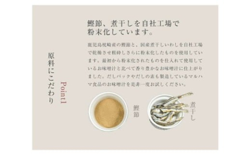 鹿児島枕崎産の鰹節と国産煮干しいわしを自社工場で粉末化したものを使用し、最初から粉末化されたものを使用した味噌汁と比べて香り豊かなみそ汁に仕上がりました。