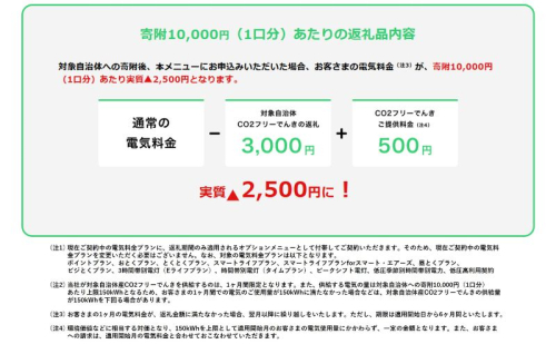 ※2 寄附10,000円(1口分)につき、返礼として3,000円分をお客さまの電気料金の支払いへ充当させていただきますが、ご提供にあたっては、寄附10,000円(1口分)につき500円(非化石証書に基づく料金)を電気料金として申し受けさせていただくため、お客さまの電気料金へ充当される金額は実質2,500円となります。【寄附10,000円(1口分)あたり3,000円-500円】