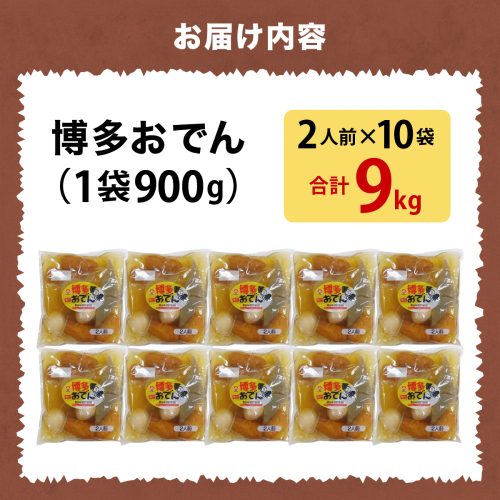 かつおベースのだしにアゴだしを加えた本格スープで味付けし、九州ではベーシックな6種類の具材(糸こんにゃく・ちくわ・玉子・ごぼう巻・三角こんにゃく・大根)が入ったレトルトおでんです。