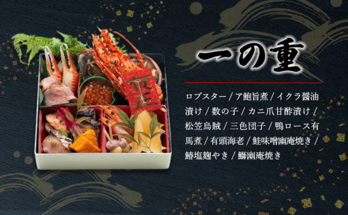 【一の重】ロブスター/ア鮑旨煮/イクラ醤油漬け/数の子/カニ爪甘酢漬け/松笠烏賊/三色団子/鴨ロース有馬煮/有頭海老/鮭味噌幽庵焼き/鰆塩麹やき/鰤幽庵焼き