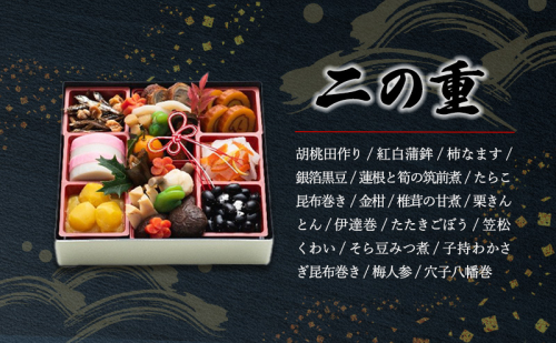 【二の重】胡桃田作り/紅白蒲鉾/柿なます/銀箔黒豆/蓮根と筍の筑前煮/たらこ昆布巻き/金柑/椎茸の甘煮/栗きんとん/伊達巻/伊達巻/たたきごぼう/笠松くわい/そら豆みつ煮/子持わかさぎ昆布巻き/梅人参/穴子八幡巻