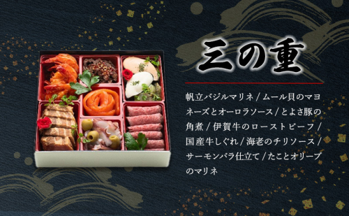 【三の重】帆立バジルマリネ/ムール貝のマヨネーズとオーロラソース/とよさ豚の角煮/伊賀牛のローストビーフ/国産牛しぐれ/海老のチリソース/サーモンバラ仕立て/たことオリーブのマリネ