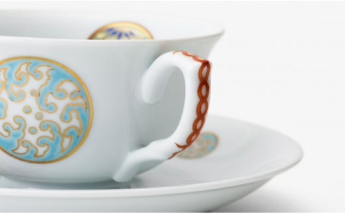 吉祥文様を鮮やかな上絵で描いた寿赤絵のティーセットです。
