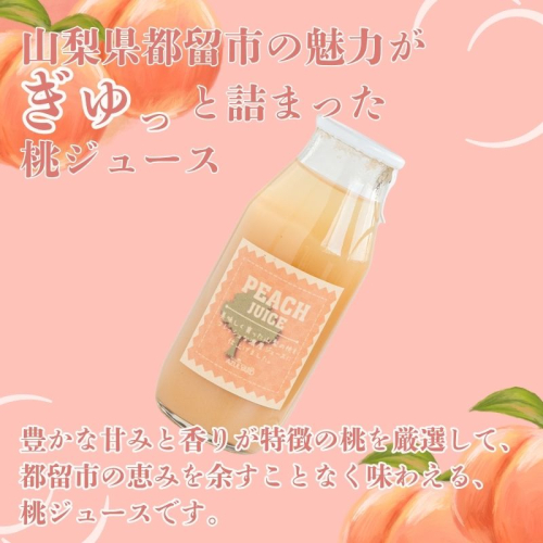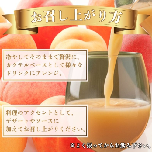 山梨県都留市の魅力がぎゅっと詰まった桃ジュース 豊かな甘みと香りが特徴の桃を厳選して、都留市の恵みを余すことなく味わえる、桃ジュースです。 -特徴- 富士山の恵みで育った桃を厳選して使用しており、果実本来の甘さと風味が豊かに広がります。 新鮮なうちにジュースに仕上げることで旬の味わいをそのままボトルに。 自然の恵が凝縮された山梨県都留市の恵みを是非味わってみてください。 -お召し上がり方- 冷やしてそのままで贅沢に。カクテルベースとして様々なドリンクにアレンジ。 料理のアクセントとして、デザートやソースに加えてお召し上がりください。 ※よく振ってからお飲み下さい