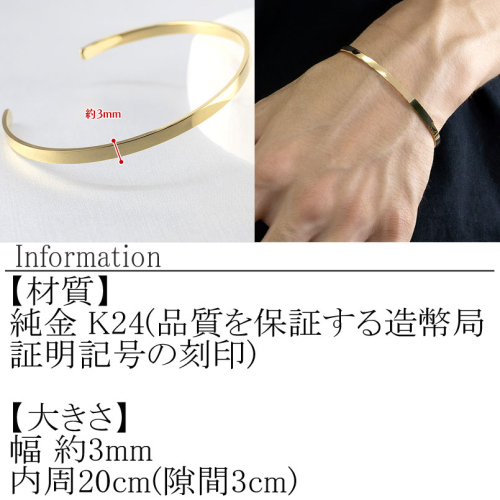 ブレスレット 純金 造幣局検定刻印付 鍛造技法 幅3mm 腕周り20cm