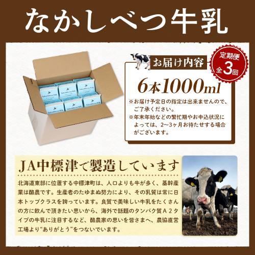 【定期便:全3回】なかしべつ牛乳1L×6本 牛乳 ミルク 乳製品 乳飲料 健康 朝食 高栄養 国産 お取り寄せ 定期便 3ヶ月 ふるさと納税 北海道 中標津町 中標津