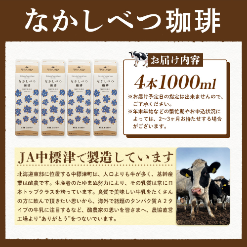 北海道なかしべつ珈琲 1L×4本 コーヒー牛乳 コーヒー 珈琲 牛乳 ミルク 乳製品 乳飲 朝食 お取り寄せ ふるさと納税 北海道 中標津町 中標津