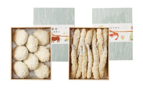 熊本で平成17年創業の「磯鷸之庄」が作る大人気のあか牛メンチカツとエビフライのセットをご準備いたしました。