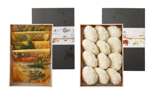 熊本で平成17年創業の「磯鷸之庄」が作る大人気のあか牛メンチカツと魚の西京漬けのセットをご準備いたしました。