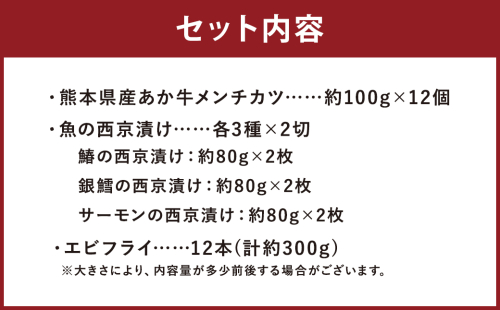 - 磯鷸之庄 熊本県産 あか牛メンチカツ 計約1.2kg (約100g×12個入) ・ 魚の西京漬け 計6切 (3種×各2切入) ・ エビフライ (12本入) のギフトセット あか牛 メンチカツ ミンチカツ 西京漬け 西京漬 漬け えびフライ 海老フライ 揚げ物 冷凍
