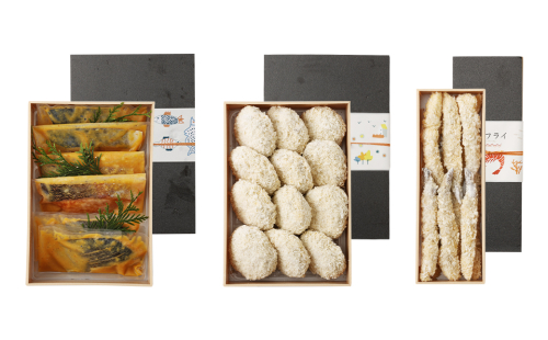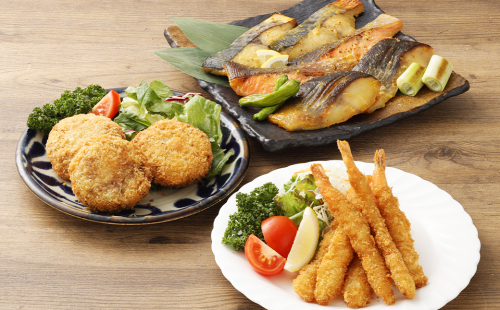 熊本で平成17年創業の「磯鷸之庄」が作る大人気のあか牛メンチカツとエビフライ、魚の西京漬けのセットをご準備いたしました。