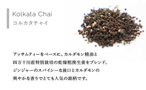 アッサムティーをベースに、カルダモン精油と四万十川産特別栽培の乾燥粗挽生姜をブレンド。
