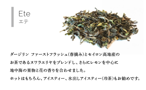 日常使いにおすすめのダージリンマスカテルブレンド。キームン紅茶にベルガモットの香りを付けた、クラシックタイプのアールグレイ。水出しアイスティー向けのエテ。煮出しミルクティーにも向くコルカタチャイ。