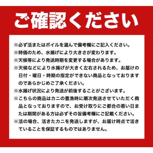 ※こちらの品はカニの豊漁時に準備が整い次第発送させていただく品となっておりますので、お受け取にご都合の悪い日または期間がある方は必ずその旨備考欄にご入力ください。