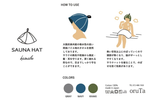 泉州タオル生地で作った綿100%のサウナハットは綿の優しい肌ざわりで吸水力はバツグンです。サウナの熱い蒸気による「のぼせ」や「髪の乾燥」を防いでくれ、快適なサウナライフを楽しめます。