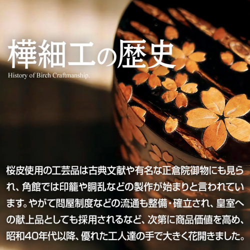 ■地場産品に該当する理由:市内事業者が原料の仕入れを行い、区域内の工房にて樺細工工芸品の製造工程のすべてを行っているもの(告示第5条第3号に該当)