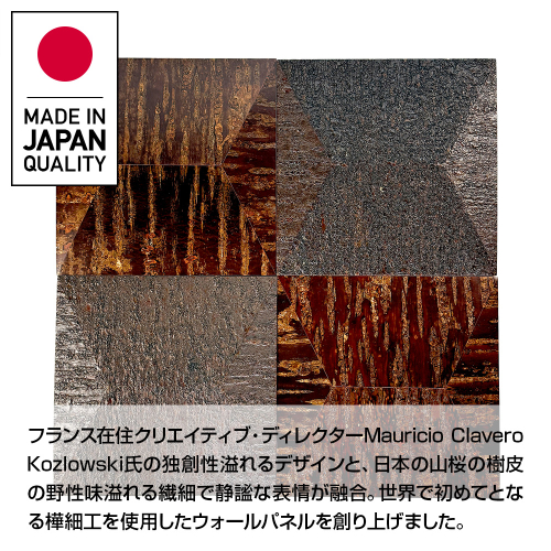 フランス在住、クリエイティブ・ディレクター、Mauricio Clavero Kozlowski氏の独創性溢れるデザインと、日本の山桜の樹皮の野性味溢れる繊細で静謐(せいひつ)な表情が融合。秋田から樺細工を使用したウォールパネルを創り上げました。